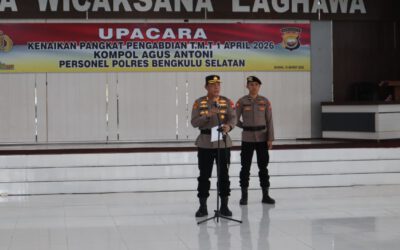 Kompol Agus Antoni Naik Pangkat Pengabdian, Kapolres Bengkulu Selatan Beri Ucapan Selamat BENGKULU SELATAN – Polres Bengkulu Selatan melaksanakan Upacara Kenaikan Pangkat Pengabdian dan Syukuran An. Kompol Agus Antoni, Selasa (31/3/2026) pukul 10.00 WIB di Aula Graha Wicaksana Laghawa, Jl. Syamsul Bahrun No 1 Kel. Padang Kapuk Kec. Kota Manna Kab. Bengkulu Selatan. Upacara ini…