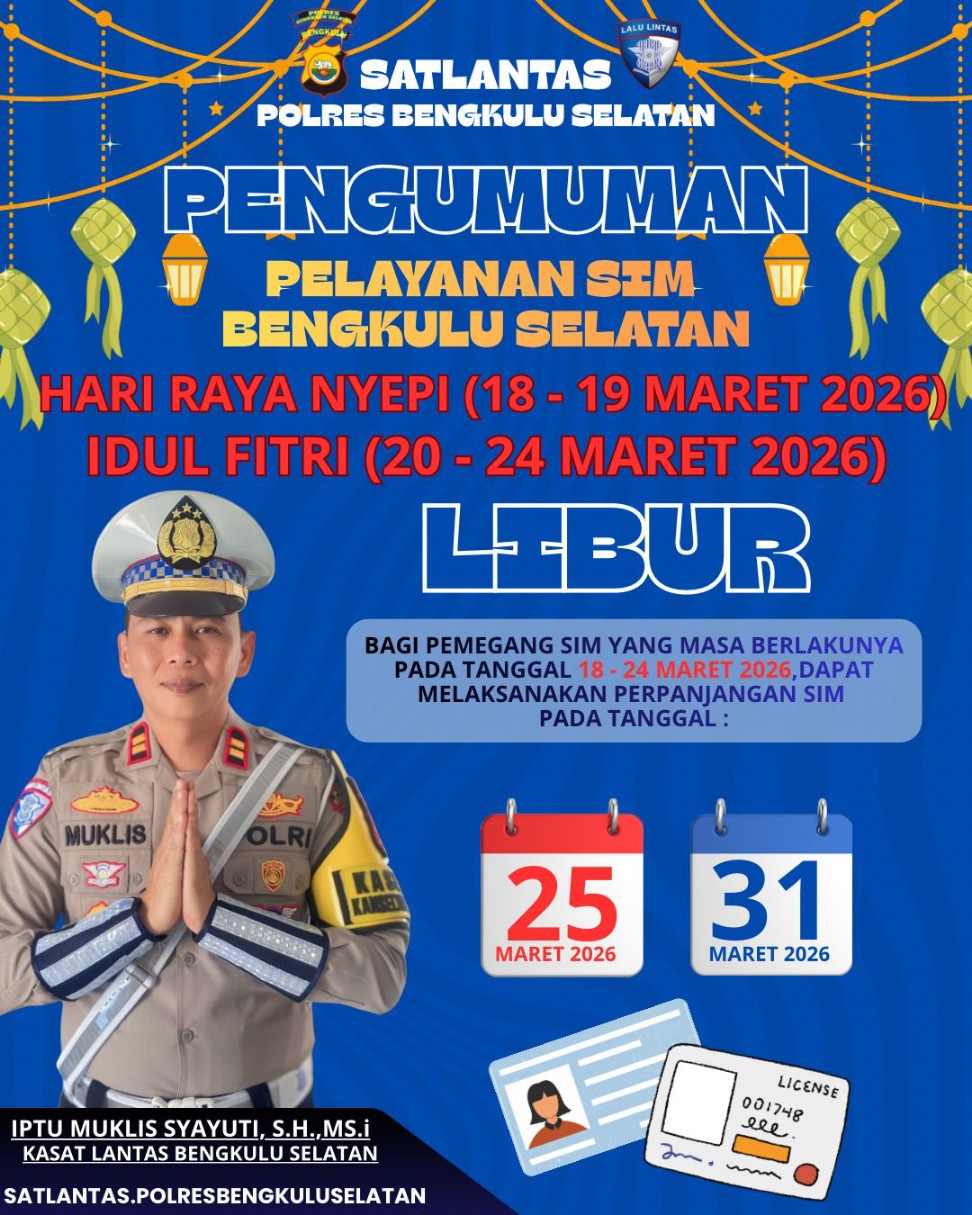 BENGKULU SELATAN – Satuan Lalu Lintas (Satlantas) Polres Bengkulu Selatan resmi mengumumkan penyesuaian jadwal pelayanan Surat Izin Mengemudi (SIM) dalam rangka peringatan Hari Raya Nyepi dan Hari Raya Idul Fitri tahun 2026.