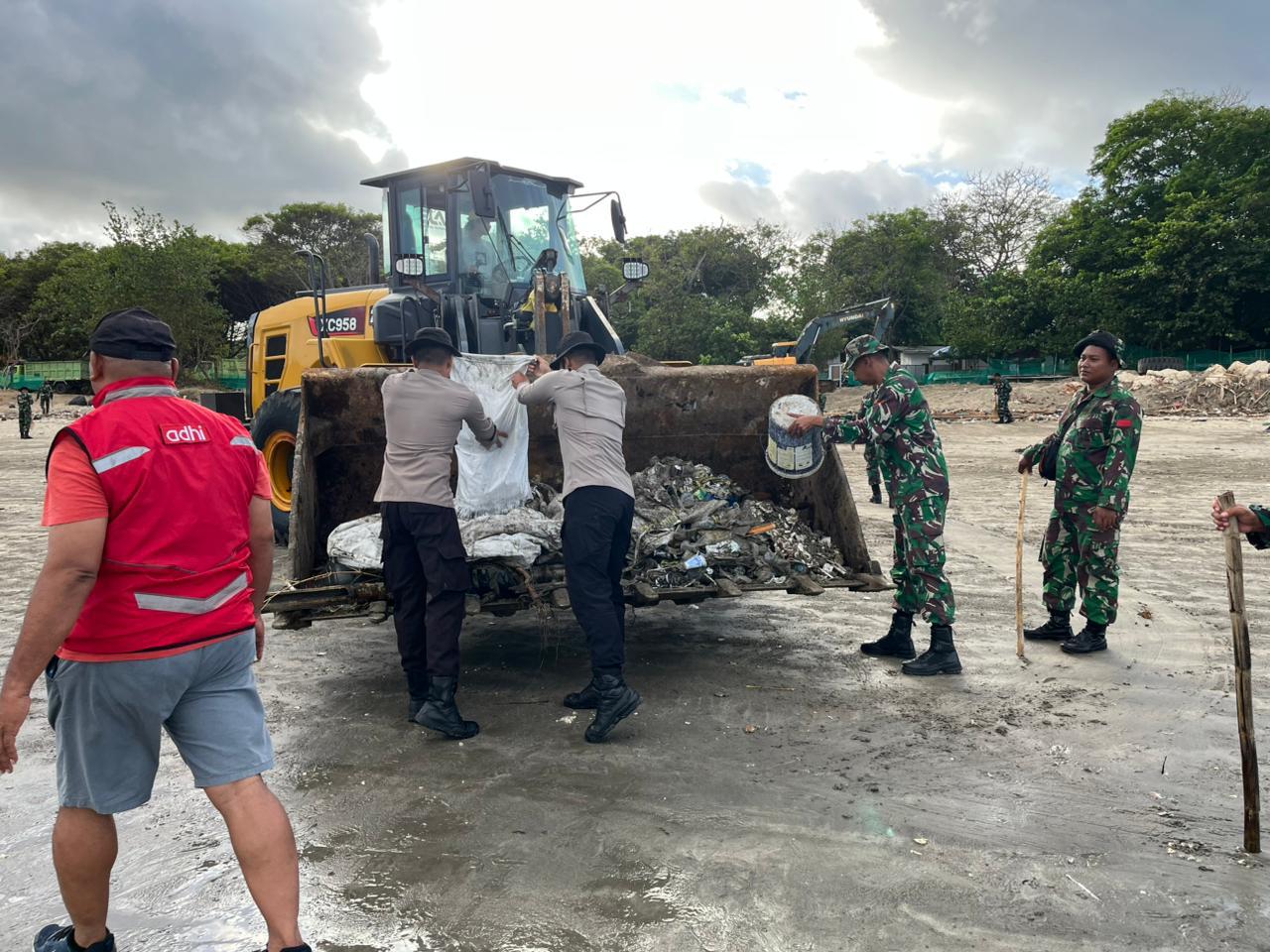 Kegiatan tersebut melibatkan personel TNI-Polri, masyarakat setempat, serta pengelola kawasan pantai. Para peserta aksi karya bakti secara gotong royong membersihkan sampah plastik, kayu, dan berbagai limbah lainnya yang terbawa arus laut dan tersebar di sepanjang garis pantai.