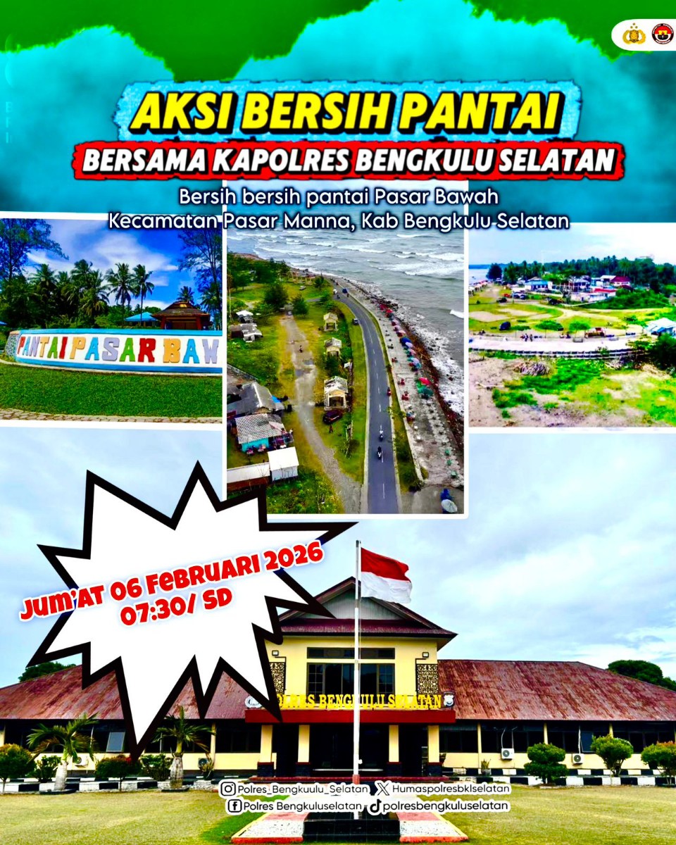 BENGKULU SELATAN – Dalam rangka menumbuhkan kepedulian terhadap kebersihan lingkungan sekaligus menjaga kelestarian kawasan pesisir, Polres Bengkulu Selatan akan menggelar Aksi Bersih Pantai yang rencananya dilaksanakan pada Jumat, 06 Februari 2026, mulai pukul 07.30 WIB hingga selesai. Kegiatan ini akan dipusatkan di Pantai Pasar Bawah, Kecamatan Pasar Manna, Kabupaten Bengkulu Selatan.