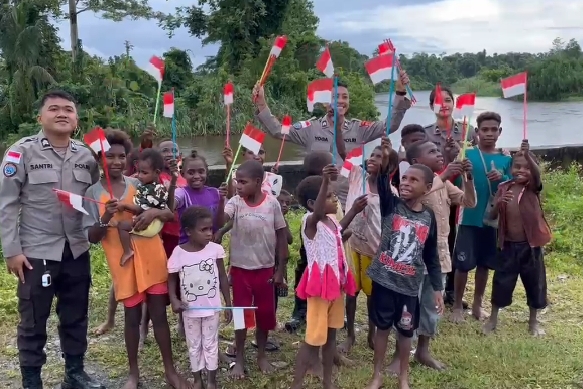 Anak-anak terlihat antusias menyambut kehadiran personel Satgas Ops Damai Cartenz sambil mengibarkan bendera merah putih kecil yang mereka terima.